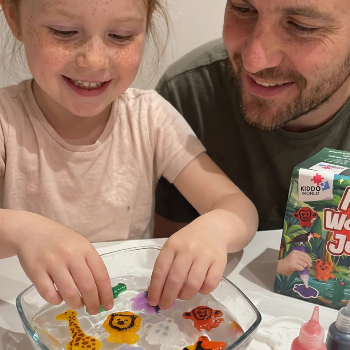 Trezește imaginația copiilor cu acest set creativ, prin care ei pot crea propria lume de animale colorate din junglă, amesteca geluri strălucitoare și observa schimbările magice de culori și texturi. Jocul stimulează activ creativitatea, motricitatea fină, învățarea culorilor și formelor, precum și concentrarea. În același timp oferă o activitate sigură, fără ecrane, plină de experiențe senzoriale. Este perfect și pentru joaca în grup, colaborare și împărțirea experiențelor cu ceilalți, consolidând comunicarea și creația colectivă.