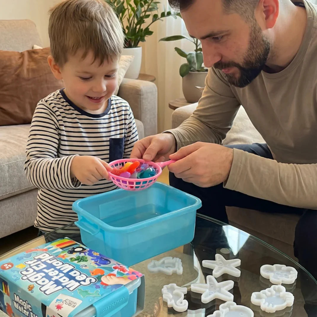 Trezește imaginația copilului tău cu acest set creativ, care le permite să creeze propria lor lume plină de creaturi acvatice colorate, să amestece geluri sclipitoare și să observe schimbările magice de culori și texturi. Jocul stimulează creativitatea, motricitatea fină, învățarea culorilor și formelor, precum și concentrarea, oferind în același timp o activitate sigură, fără ecrane, plină de experiențe senzoriale. Este perfect și pentru jocul în grup, colaborare și împărtășirea cu ceilalți, întărind comunicarea și creativitatea în echipă.